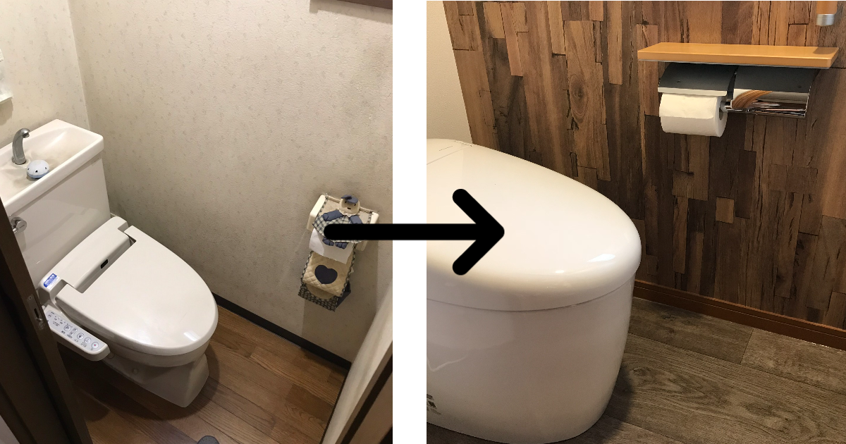 TOTOネオレストに交換しました。設置場所が階段下と言うのもあり見た目がスッキリした空間と考えました。クロスは、白を基調にアクセントで、木目縦方向に空間を高く見せる様にして床CF材も質感を出す為に厚みのある物をチョイスしています。