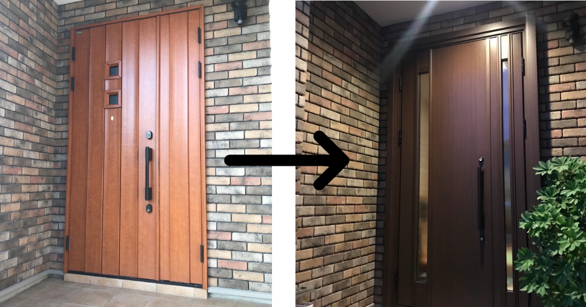今回取り付けた玄関ドアYKK製品のカバー工法になります。施工1日で出来ます。玄関の明かり取りが、既存ドアより欲しいのと、重厚感を出したいとのご要望です。断熱ドアで色も建物に合う様にして額縁の厚みもあるので雰囲気が出たと言われてました。