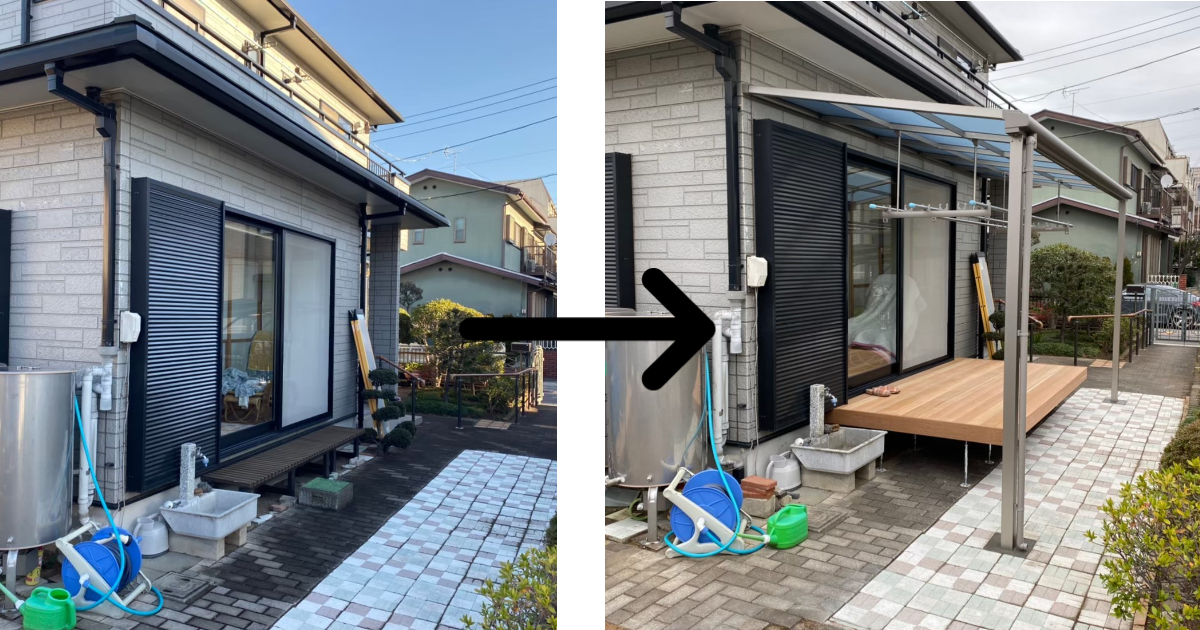 お客様のお母様がご高齢になり、洗濯物を1階から2階へ運ぶのが大変になってきたとの事でご相談を受けました。こちらの場所が日中の日当たりが良いいので、こちらに屋根付きウッドデッキをご提案させていただきました。ウリン材を使用して高耐久のウッドデッキに仕上げ、テラスも汚れにくく、雨が降れば汚れも光触媒の力で落ちやすい、ポリカーボネートタイプ。洗濯物はもちろん、日中の日向ぼっこや、お庭鑑賞など、リラックス出来るスペースを作る事が出来、お客様お気に入りの空間とおっしゃっていただきました♪