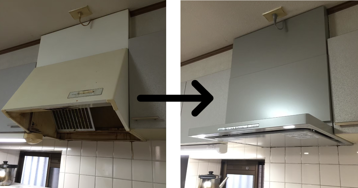 油でギトギトになり奥がプロペラ換気扇の為に吸込みが悪くて、料理中も滅多に使用しなくなっていたとの事で、レンジフードの取替をオススメ致しました。料理をされる際に換気扇を回さないと油汚れなどがキッチン周りはもちろん、部屋中の壁につき、そこにホコリが付着しやすい状況になります。シロッコファンタイプで吸込みが良くなり、お手入れ・お掃除もしやすいタイプを選定していただけましたので、これからの料理が楽しみとおっしゃっていらっしゃいました♪コンロだけでなく、レンジフードのみの取替も出来る事をお客様は驚いていらっしゃいました。もちろん出来ます!気軽にご相談ください(^^)